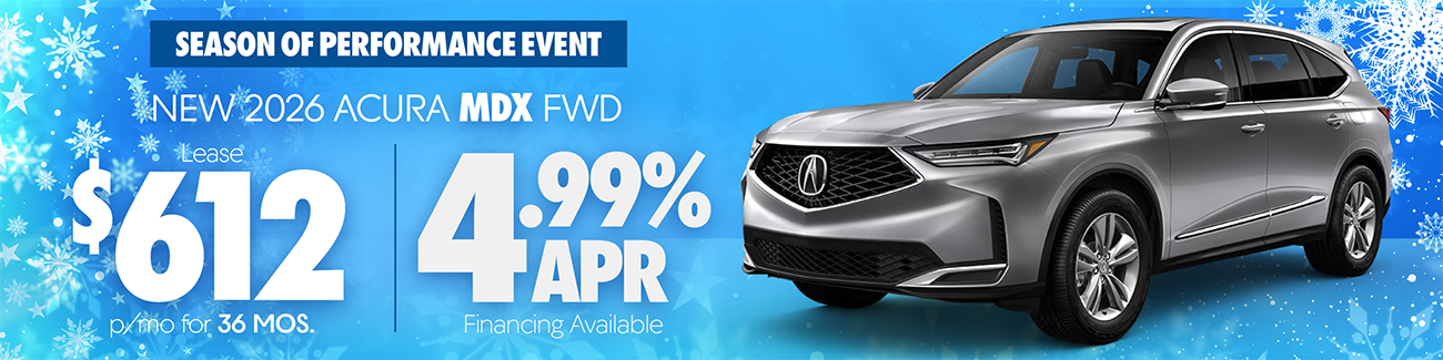 Prices include all costs to be paid by consumer except for licensing, registration, taxes and $387 doc Fee. 4.99% APR Available through Acura Financial Services on new 2026 Acura MDX models only. Includes Type S Models. Terms may vary. Cannot be combined with other offers. Requires Tier 1+ credit, not all guests will qualify. Lease offer through Acura Financial Services. Available on the 2026 Acura MDX SH-AWD only. $612/month, $5,999 down, 3-year lease, 10,000 miles a year. Does not include security deposit. Requires Tier 1+ Credit. Not all guests will qualify. Offers expires 1/4/26. Vehicle image for illustration purposes only.